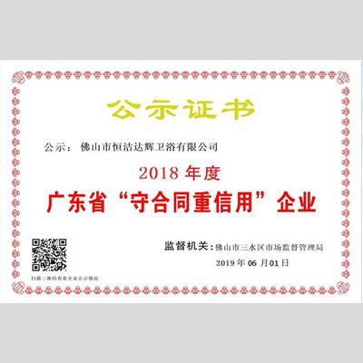 獎 項:"2018年度廣東省“重合同守信用”企業 ——佛山市恒潔達輝衛浴有限公司"