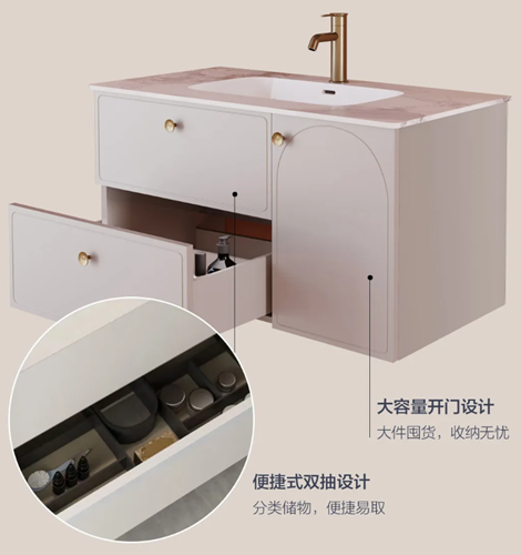 除核心材質外,設計細節同樣影響使用感。潮濕環境中,防潮工藝是重中之重 —— 柜體邊緣的密封處理、內部防潮涂層,能有效阻隔水汽滲透,延長使用壽命;收納系統的合理性,則直接關系浴室整潔度與使用便捷性,分層分區設計可讓洗護用品有序歸位,減少臺面雜亂與清潔壓力。此外,一體化成型、無衛生死角的臺面設計,能大幅降低清潔難度,讓日常護理更省心。