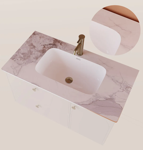 臺面有陶瓷盆和無縫巖板兩種選擇:陶瓷盆抗污易清潔,水漬、牙膏漬一擦即凈;無縫巖板耐高溫、抗刮磨,一體成型無衛生死角。兩種臺面均能快速清潔,幾分鐘沖洗便可恢復光潔,完美平衡美觀與實用。