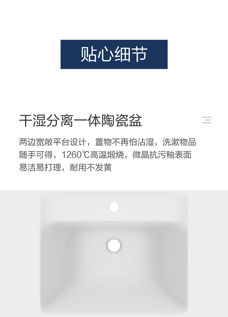 - 一體式易潔陶瓷盆,釉面平滑易潔;兩邊寬敞平臺設計,洗漱用品隨手可得;四周圓角打磨,防止磕碰撞傷;導流溢水孔設計,防止水溢出臺面;
