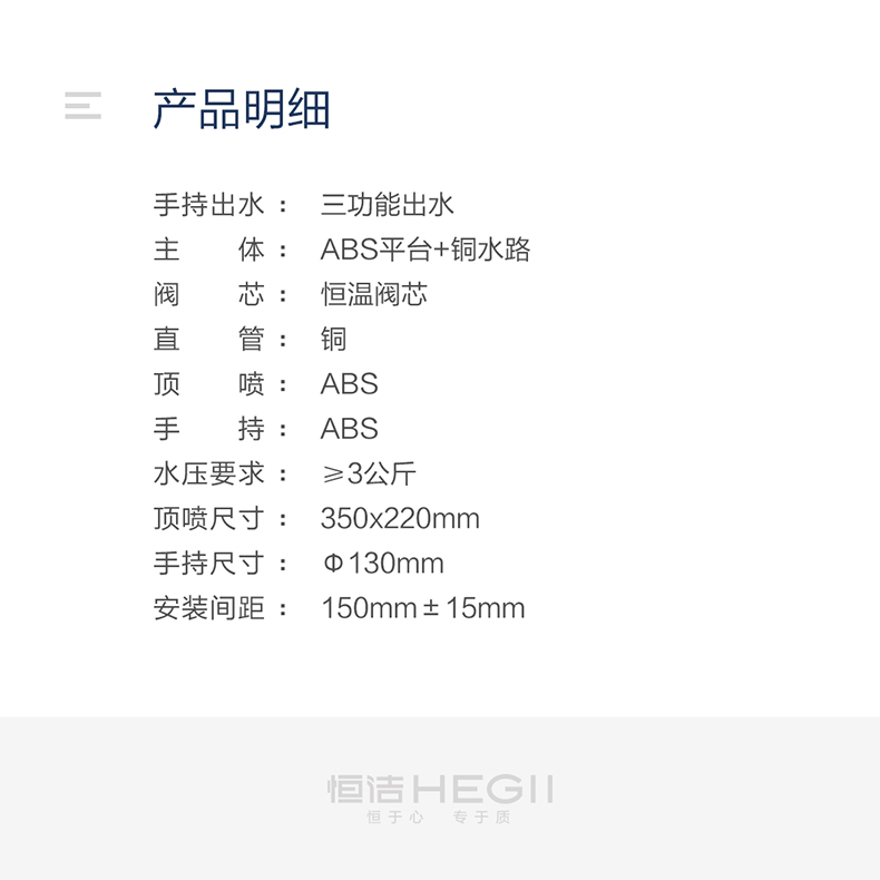 - Φ130mm大面板手持,三種淋浴體驗,多重享受