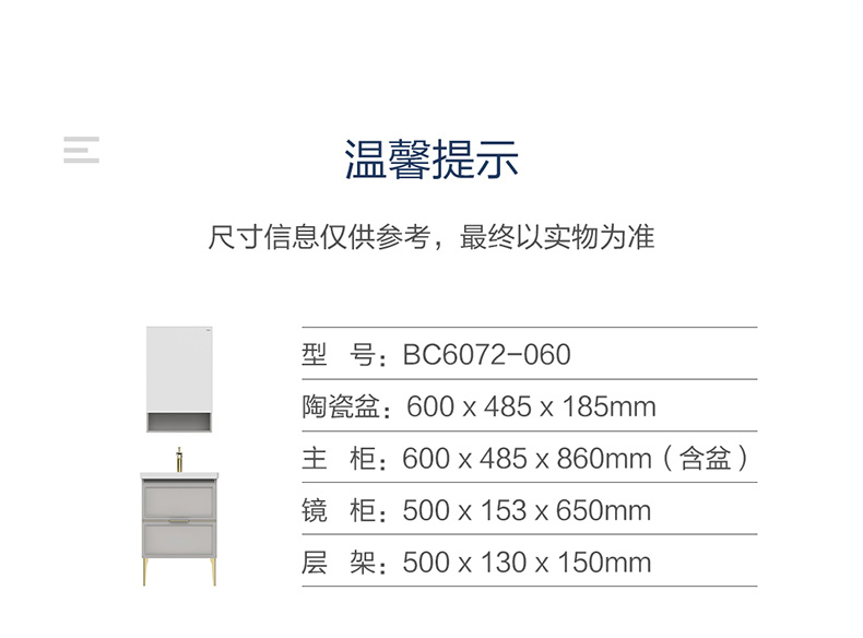 雙材質運用:鋁合金鏡柜,抑菌防霉,防潮耐用;柜身生態(tài)木,免漆環(huán)保,面板使用鋁型材立體邊框;