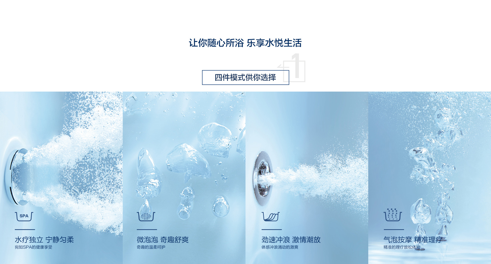 勁速沖浪按摩系統、微泡泡按摩系統及汽泡按摩系統四件模式供你選擇,讓你隨心所浴,樂享水悅生活